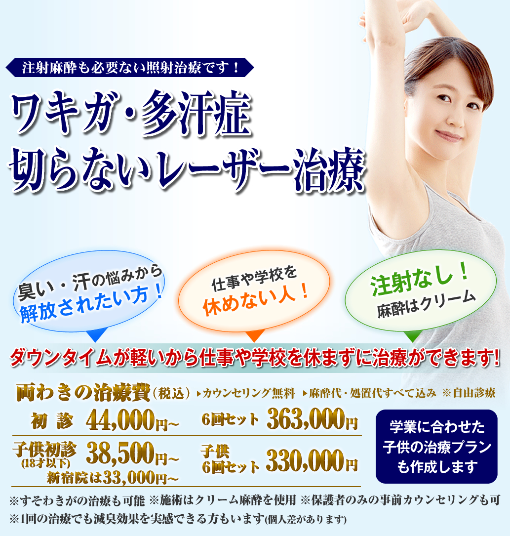 当院で採用するわきがレーザー治療は術後のダウンタイム(キズや腫れ)がほとんどないので、学校生活も普段通りに過ごせます。早めの施術が効果的な治療結果に結びつきますので、臭ったらまずカウンセリングにいらしてください。